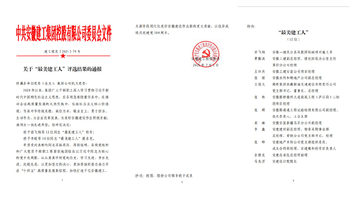7月1日至7月2日,安徽建工集團(tuán)控股有限公司二屆一次職工代表大會(huì)暨“七一”表彰會(huì)在合肥召開(kāi)。會(huì)上表彰了12名“最美建工人”榮譽(yù)稱(chēng)號(hào)獲得者,安徽安裝公司柴琳獲此殊榮。