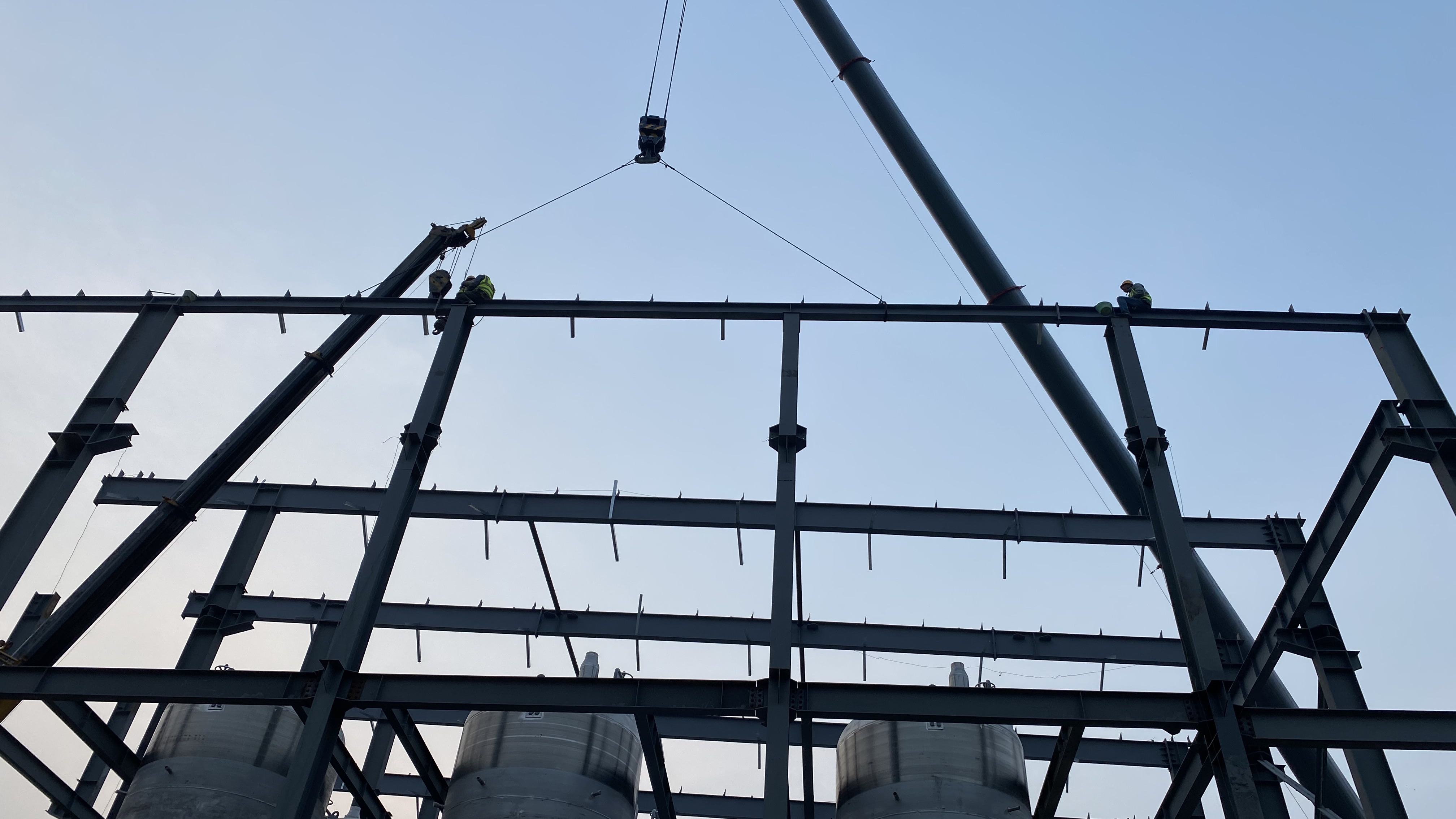 發(fā)酵車間吊車大臂高展,C區(qū)鋼結(jié)構(gòu)工程鋼梁安裝正在進(jìn)行,司索工鋼梁綁扎穩(wěn)固后,現(xiàn)場(chǎng)信號(hào)工發(fā)出清晰信號(hào),經(jīng)驗(yàn)豐富的司機(jī)操控著吊車將鋼梁緩緩升起,20米的高空上,兩名安全防護(hù)的工人等待著鋼梁靠近,停穩(wěn)、就位、穩(wěn)固、矯正、固定...一道道鋼梁就這樣架起,發(fā)酵車間的金屬骨架就這樣拔地而起,逐步形成。