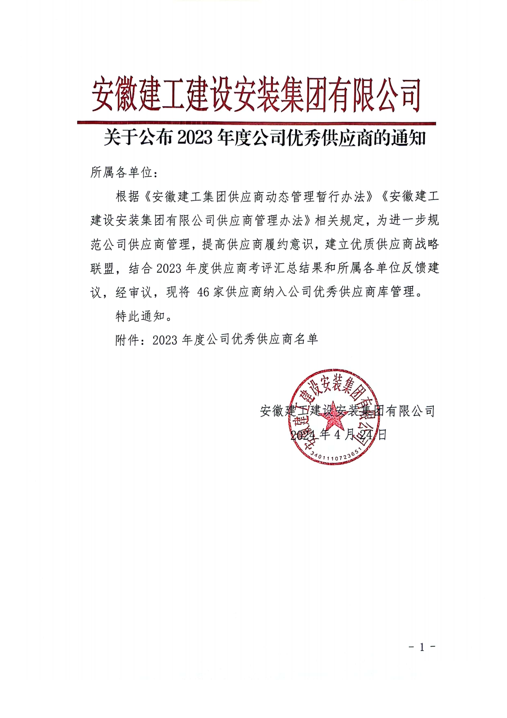 關(guān)于公布2023年度公司優(yōu)秀供應(yīng)商的通知
